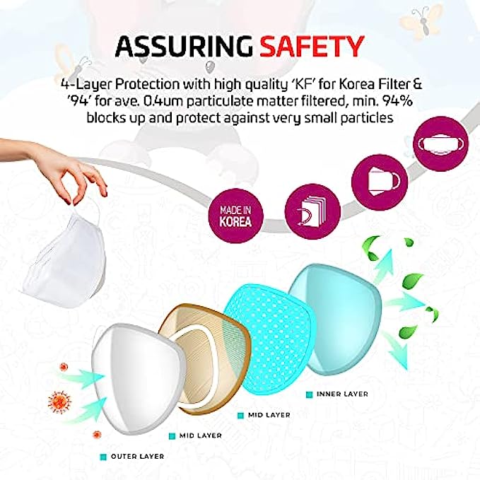 Korean High Quality Filter Non-Woven Material Made in Korea and Imported Adjustable closure ✅ BEST KIDS PROTECTION – This Extra Small KF94 disposable face mask is made with high quality MB fabric that is effective. Made with a triple-layered electrostatic filtration system, this product will filter at least 94% of PM2.5 to protect the wearer from exposure to harmful dust. This children's mask is very effective in protecting from dust, air pollution, and more. Protect your children’s health with these disposable face masks for kids. ✅ EASY BREATHING : GoodDay KF94 kids face masks fit securely on your face so that you can breath easily and keep the mask on all day without discomfort. ✅ COMFORTABLE FORM FITTING DESIGN : GoodDay kids disposable face masks have a 3D flat-fold(tri-fold) design that prevents air leakage. Use the nose bridge The adjustable nose bridge helps to ensure a secure fit and stays on your face without slipping or falling off. The perfect fit prevents fogging up your glasses. ✅ EVERYDAY USE & BACK TO SCHOOL: This Kids Mask is suitable for school, shopping, cycling, camping, running, travel, climbing and daily use. This mask will be your children's favorite mask providing them with a comfortable and cute design! ✅ KFDA APPROVED: GoodDay safety kids masks are manufactured in South Korea. The masks are KFDA approved.